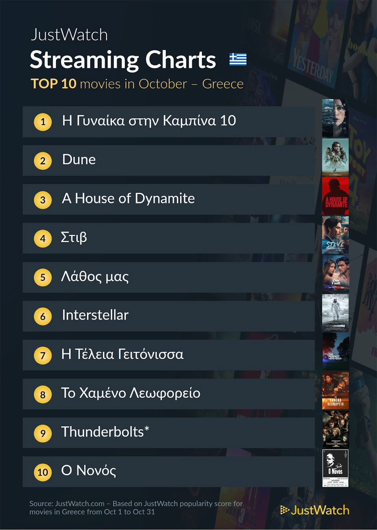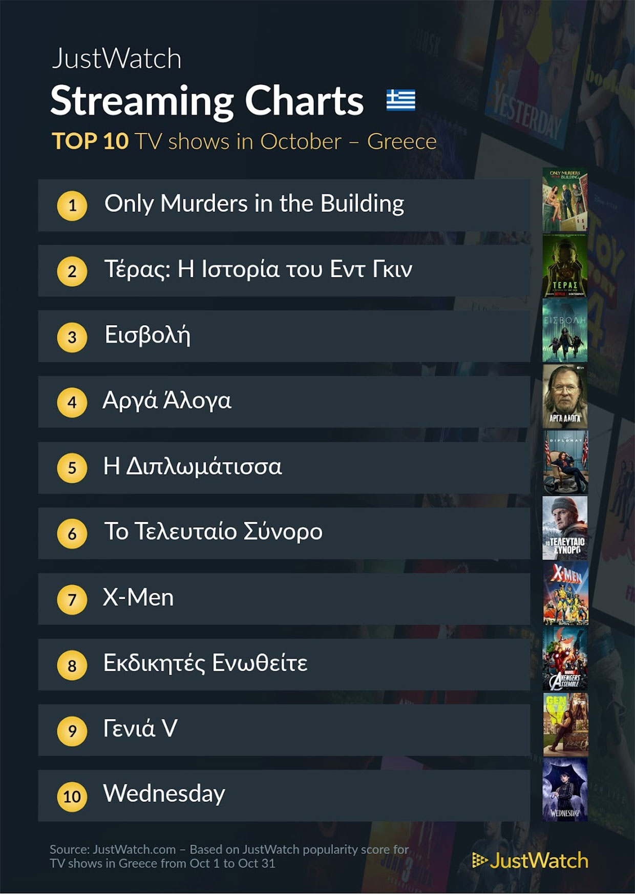 Αν και τα στοιχεία της JustWatch είναι ανεπίσημα - υπό την έννοια πως δεν στηρίζονται σε στατιστικά στοιχεία θέασης που παραχωρούν οι ίδιες οι Netflix, Disney, Amazon, Apple ή Mubi - παραμένουν ενδεικτικά και έχει ενδιαφέρον να διαπιστώνουμε πώς διαμορφώνονται κάθε μήνα. Για να δούμε τί θα προτιμήσουν να παρακολουθήσουν οι Έλληνες τηλεθεατές στην διάρκεια του Νοεμβρίου, λοιπόν!