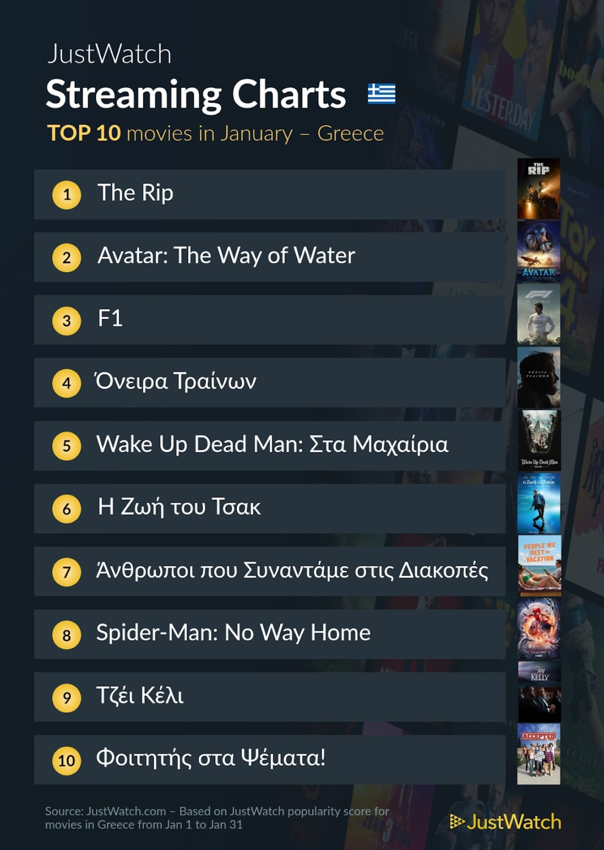 Βάσει των στοιχείων που έχει στην διάθεσή του το JustWatch, οι δημοφιλέστερες ταινίες Δικτυακής διανομής στην χώρα μας τις τελευταίες εβδομάδες είναι οι παρακάτω: