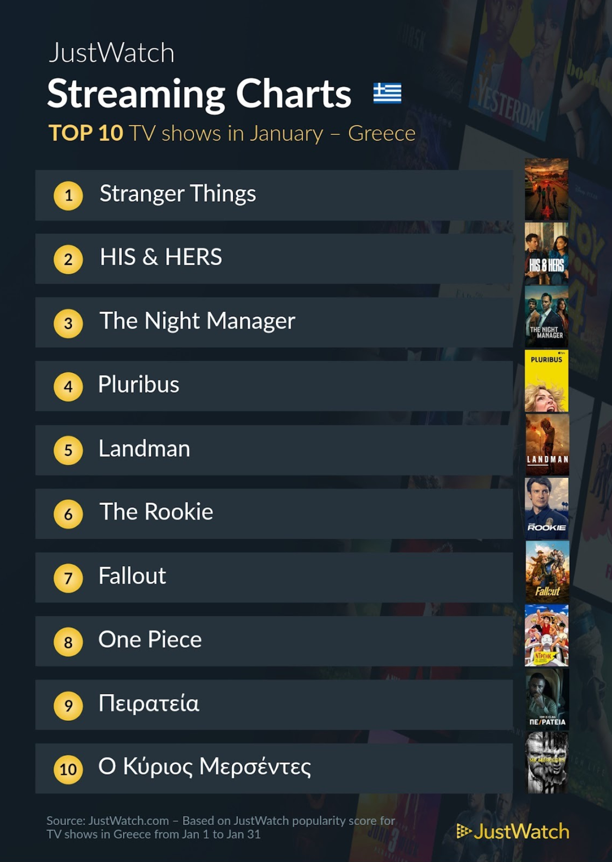 Αν και τα στοιχεία της JustWatch είναι ανεπίσημα - υπό την έννοια πως δεν στηρίζονται σε στατιστικά στοιχεία θέασης που παραχωρούν οι ίδιες οι Netflix, Disney, Amazon, Apple ή Mubi - παραμένουν ενδεικτικά και έχει ενδιαφέρον να διαπιστώνουμε πώς διαμορφώνονται κάθε μήνα. Για να δούμε τί προτίμησαν να παρακολουθήσουν οι Έλληνες τηλεθεατές στην διάρκεια του Φεβρουαρίου, λοιπόν!