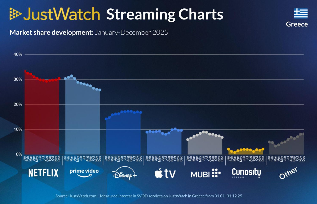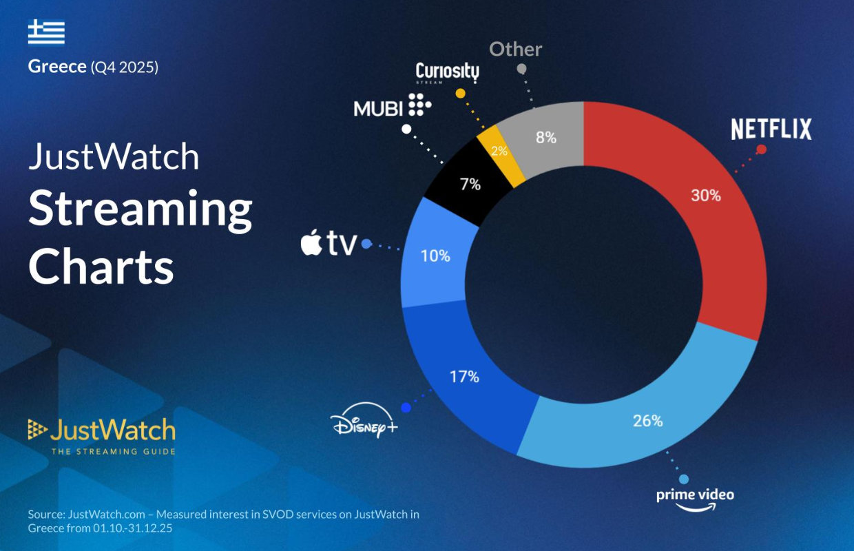 Με την διαδικασία της διάθεσης όλων των μεγάλων υπηρεσιών ψυχαγωγίας μέσω streaming στην Ελλάδα πια ολοκληρωμένη έχει ενδιαφέρον να παρακολουθούμε τακτικά πώς εξελίσσεται ο κλάδος αυτός στην δική μας αγορά. Αν και δεν δημοσιεύονται επίσημα στοιχεία συνδρομητικών βάσεων ή μεριδίων αγοράς για την Ελλάδα από καμία υπηρεσία streaming που προσφέρει το περιεχόμενό της εδώ, έχουμε μία εικόνα του πώς αυτά διαμορφώνονται στην χώρα μας από - ανεπίσημα μα ενδεικτικά - στατιστικά στοιχεία που μάς παραχώρησε η JustWatch για το τέταρτο τρίμηνο του 2025, οπότε και τα συνολικά για την περασμένη χρονιά.